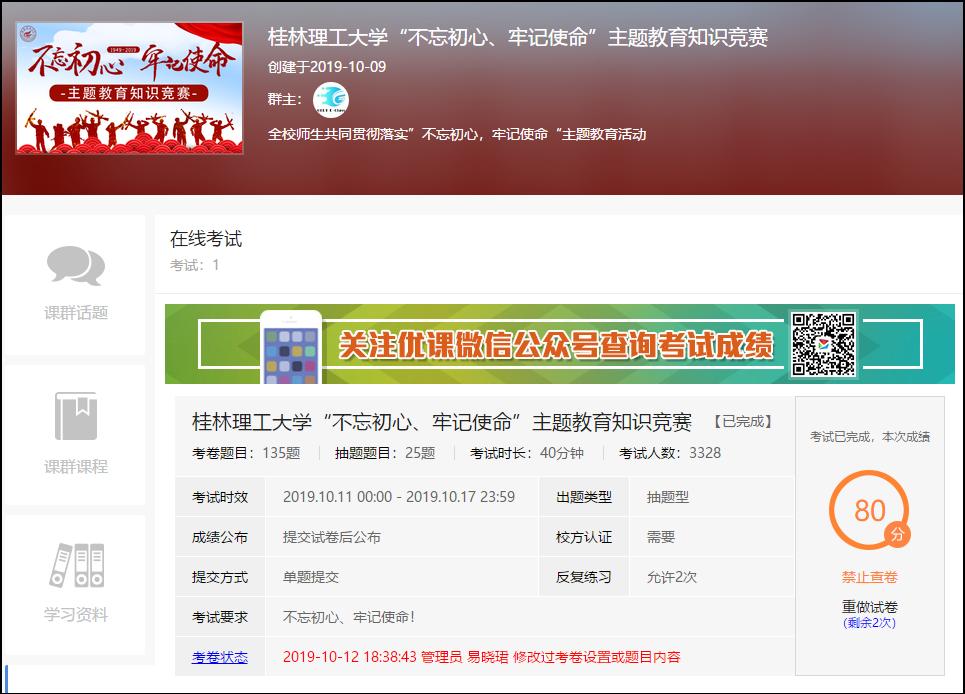 为深入学习贯彻习近平新时代中国特色社会主义思想,贯彻落实中央、自治区党委和学校"不忘初心、牢记使命"主题教育有关文件精神,庆祝中华人民共和国成立70周年,10月11日至10月17日,学工部(处)、团委党支部组织我校师生开展了"不忘初心、牢记使命"主题知识竞赛活动,活动取得良好成效。